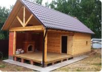 Завершено строительство бани из бруса с террасой в п. Борисоглебское г. Казань. Общие размеры застройки 4 на 6 метров - 24 м2. Баня 4 на 4 из бруса разделена 2 перегородками на 3 отдела, комната отдыха, моечная (душевая) и парная. Терраса открытая с декором до половины балясинами. Баня из бруса с террасой построена за 7 дней (без электрики и пропитки антисептиками).