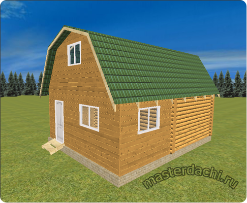 Собственно, сруб дачного дома (площадью 20 кв.м.) представляет собой просторную комнату с лестницей на мансардный этаж. Делить это помещение нецелесообразно из-за небольших размеров, практичнее использовать его в качестве общей комнаты. Мансарда (28 кв.м.) становится на такой даче идеальным жилым помещением: в ней можно обустроить большую спальню или выделить пару изолированных комнат для хозяев и гостей.