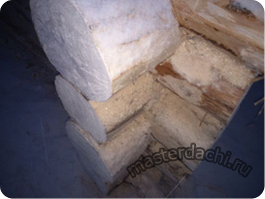Между бревнами желательно выкладывать утеплитель, который будет защищать баню от холода.