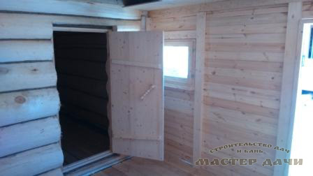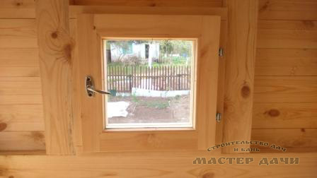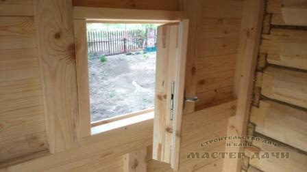 Окна изготовлены из массива дерева, с двойным остеклением и форточкой для проветривания бани. Размеры зависят от площади застройки деревянной бани, для небольших 500х500 мм, а для больших строений бань окна используются от 600х800 мм до 800х1000 мм. Расстановка окон, обговариваются с заказчиком в начале совершения строительства бани. Их установка обязательна так как баню необходимо проветривать и просушивать для того чтобы не образовывался грибок который может привести к большим неприятностям.