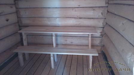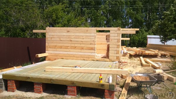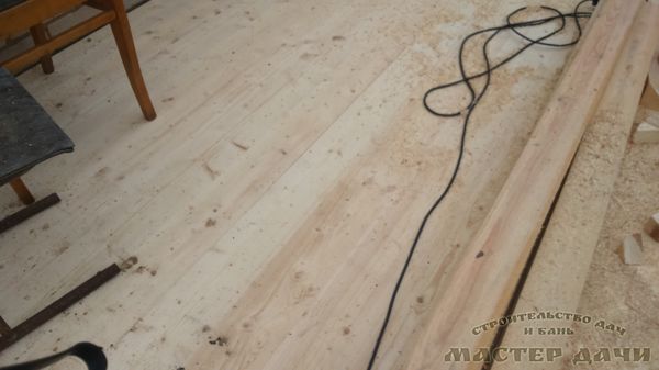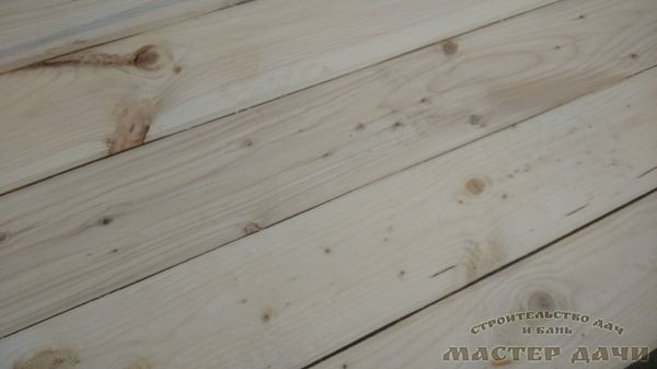 На выложенные из кирпича тумбочки устанавливаются половые лаги из бруса 50 на 150 либо 100 на 150 мм в зависимости от строения. Затем укладываются обрезные половые доски толщиной 40 мм и шириной 150 мм. В процессе строительства бани из дерева половая доска строгается с трех сторон и снимается фаска для беспрепятственного стека воды. Между досками оставляем щели по 1 - 2 см для того чтобы вода не задерживалась и утекала в сточную яму бани. Материалом служат хвойные породы древесины (сосна, елка)