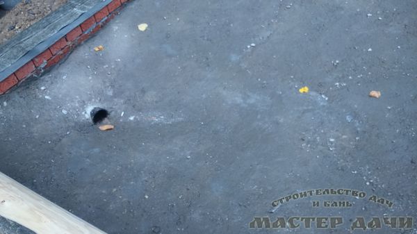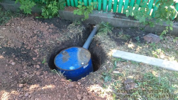 При заливке фундамента в оставленном выкопанном месте укладываем 110-ый отвод для стека воды. Яма копается в ручную для железной бочки размером в 200 литров. У бочки срезается дно, для того чтобы сточные воды бани не задерживались, а самотеком впитывались в землю. Такого объема канализации вам хватит на долго и не нужно будет переживать за то, как скоро наполнится бочка.